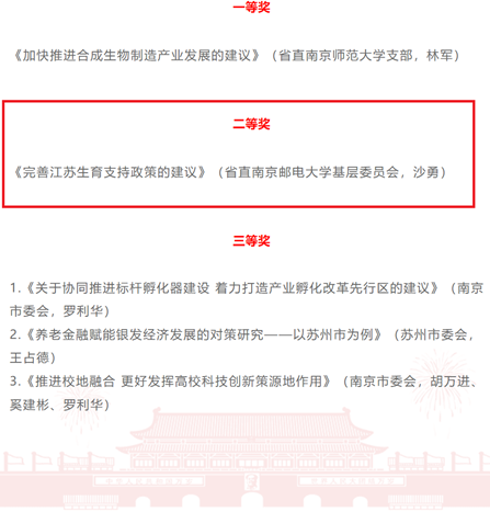 近日,中国农工民主党中央委员会公布了《关于农工党中央长江生态环境保护民主监督2024年度优秀课题研究报告的通报》,及《关于2024年度优秀调研报告评选结果的通报》,其中南京邮电大学社会与人口学院学院院长、高质量发展评价研究院执行院长、农工党中央人口均衡发展工作委员会主任沙勇教授所在团队报告荣获农工党中央长江生态环境保护民主监督2024年度优秀课题研究报告一等奖,其所撰写的《完善江苏生育支持政策的建议》调研报告荣获2024年度优秀调研报告二等奖。