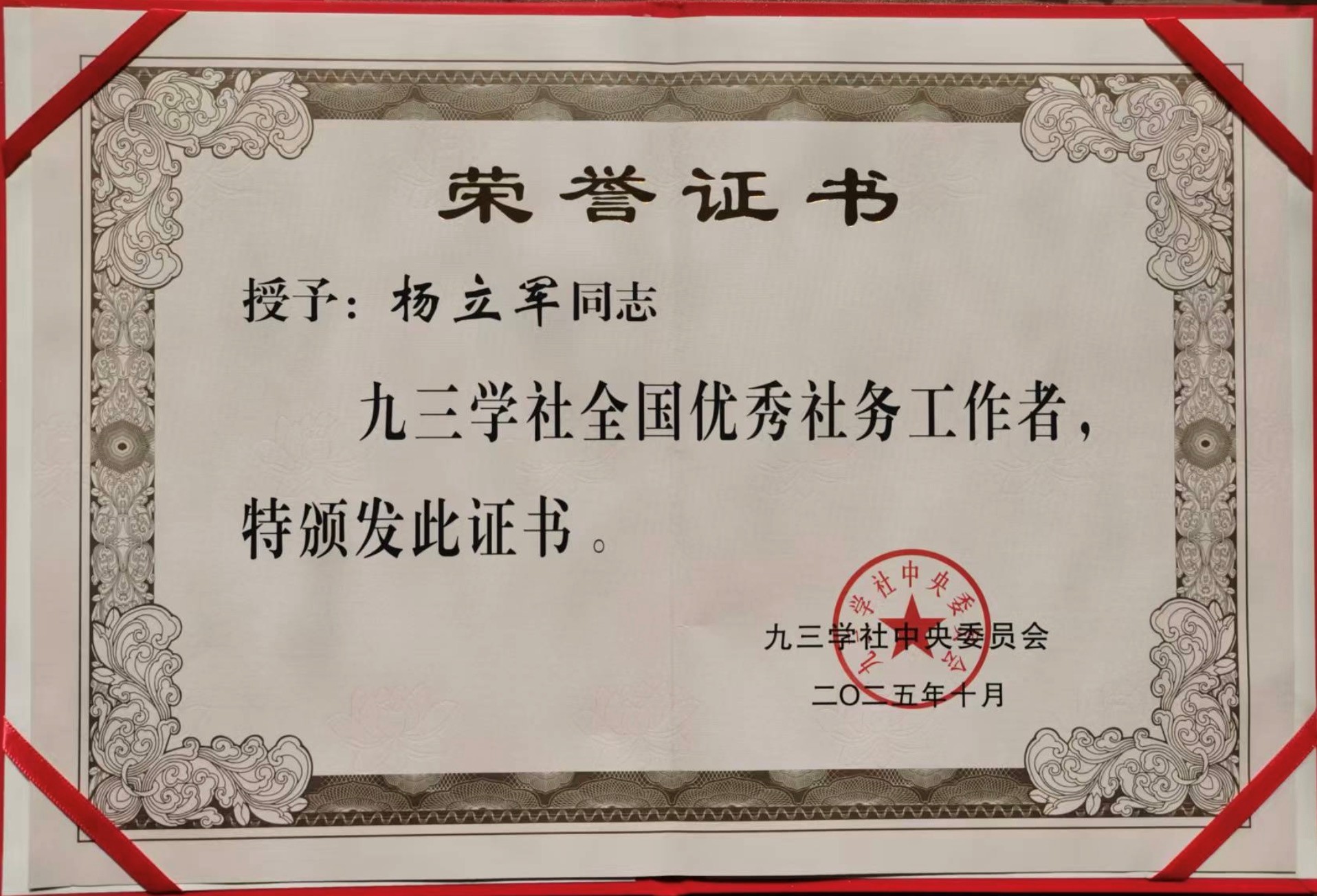 九三学社杨立军同志荣获“九三学社全国优秀社务工作者”称号